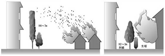 ホーム > くらし・環境 > 住まい > 環境共生住宅 > 方針3:地域適合・環境親和 > まちに快適な環境をもたらす > 取り組み例(樹木による防火機能を利用する)