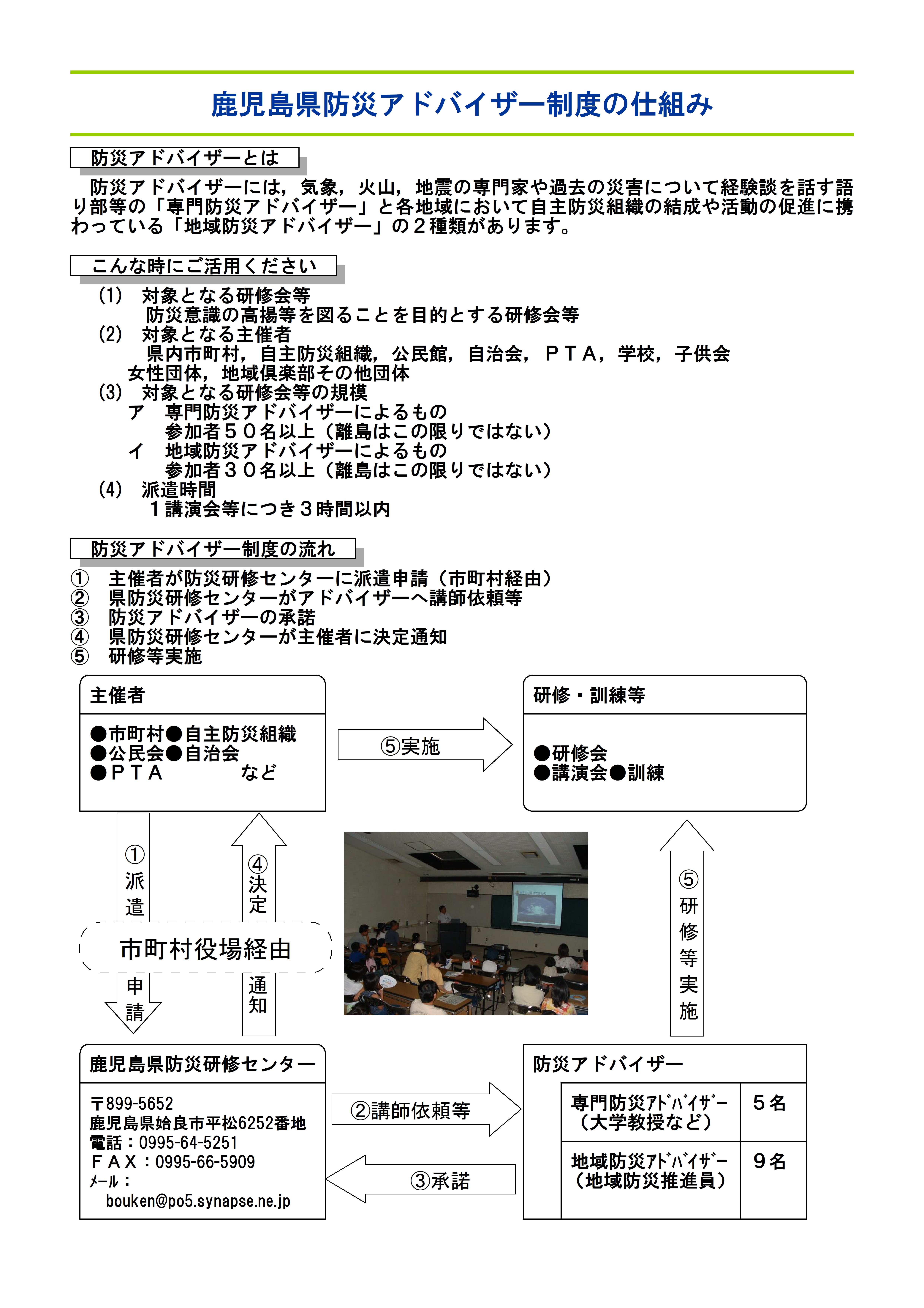 | 吉水康夫 | 火山,地震,避難,自主防災組織,過去の災害,DIG他 | 県地域防災推進員(平成25年度),防災士 |
