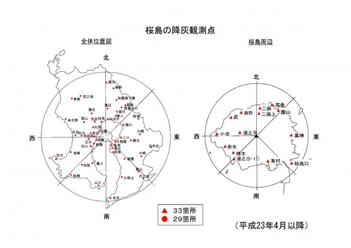 桜島の降灰量観測調査については,平成23年4月から県内62箇所(59箇所:H7~H22,58箇所:S53~H6)で観測(単位:グラム/平方メートル)しています。