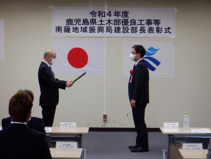 このたび,南薩地域振興局建設部において発注した令和3年度完成工事を対象に優良工事,優秀技術者,若手有望技術者を選定し,令和4年10月7日(金曜日)に表彰式を行いました。(以下,敬称略)