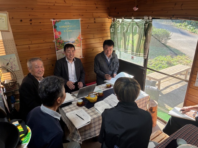 11月14日,出水市の茶生産者事務所で経営改善個別検討会を実施し,茶生産者家族及びかごしま農業経営・就農支援センター派遣の農業経営スペシャリスト2人を含む8人が出席しました。ファイナンシャルプランナーからは,余剰金の活用方法として各種共済制度について助言を,中小企業診断士からは,SWOT分析をもとにしたアクションプランの提案がありました。また,農政普及課からは,両専門家の資料をもとに長期生活設計を提案しました。生産者は「的確な助言等が多く,すぐ改善したい」と手応えを感じていました。