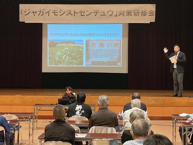 11月6日長島町で,県園芸振興協議会が主催する「ジャガイモシストセンチュウ対策研修会」が午前,午後に分かれて開催され,計141人の生産者が出席しました。研修会では,同害虫の脅威や種場産地である北海道の現状の周知,本県育成の抵抗性品種「しまあかり」,「こいじゃ」の紹介等を行いました。会場からはさまざまな質問が出され,生産者の関心の高さがうかがえました。しかしながら,「今までジャガイモシストセンチュウについて知らなかった」と答えた生産者が過半数以上おり,今後も引き続き啓発を行っていきます。
