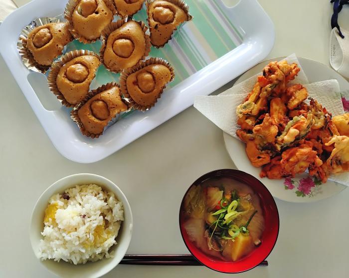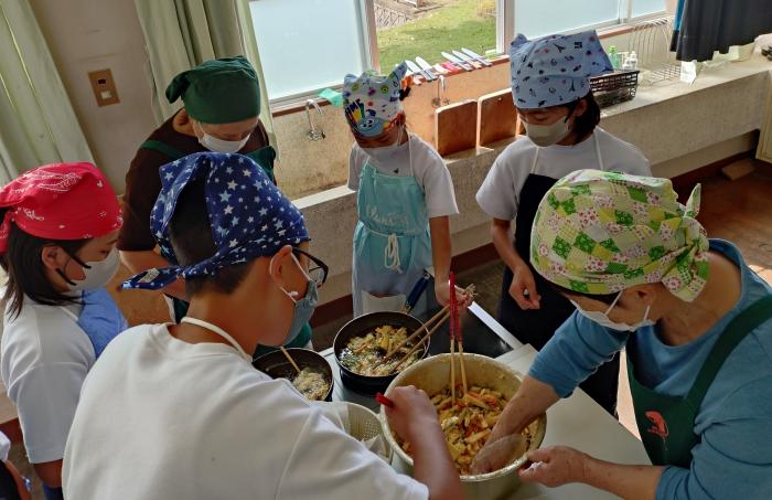 10月30日,出水市立江内小学校で,食育支援体制の一環として出水地域生活研究グループによる調理実習が実施されました。5年生8人が校内で栽培したさつまいもを使い,平成27年に県民投票結果をもとに制定された「かごしまの味」から,さつまいもご飯,さつま汁,がね等の郷土料理を,4人のグループ員の指導のもと実習しました。子どもたちは,皆熱心に取り組み,「めっちゃおいしい」「家でも作ってみる」という声が聞かれるなど大好評でした。家庭での食育を支える役割が期待されます。