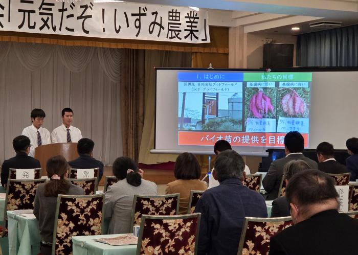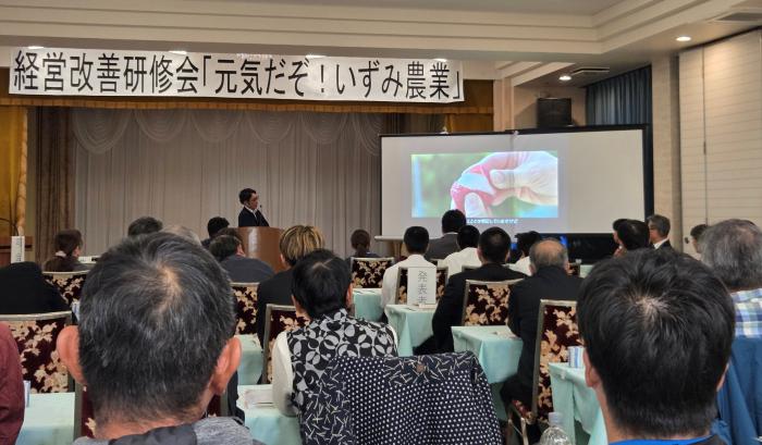 11月17日,出水市の鶴丸会館で,農業経営者クラブいずみ支部主催の経営改善研修会「元気だぞ!いずみ農業」が開催され,クラブ員を含む農業者及び関係機関67人が出席しました。今回は「農産物のブランディング及びマーケティング」をテーマに,一般財団法人こゆ地域づくり推進機構による講演後,実際にブランディングやマーケティングを実践している農業者による事例発表がありました。また,青年農業者と鶴翔高校生から,プロジェクト活動の発表がありました。今後も経営改善に向けて,農政普及課は地域農業者を支援します。