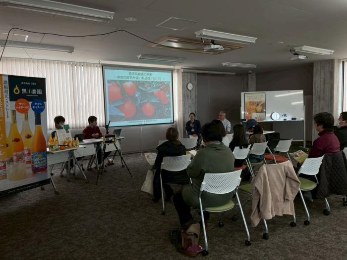 12月7日,長島町の日本マンダリンセンターでマンダリン祭が開催され,新品種「KC-5」の紹介及び試食を行いました。農政普及課は,イベントのみかん授業で,「KC-5」の特徴や現地導入状況等を説明しました。また,授業に参加した20人を対象に,農業開発総合センターで生産された果実の試食会を行いました。参加者からは,「一口目から甘さと香りが出る」,「粒をひとつずつ感じる」,「手に収まる大きさでちょうど良い」等と好評の声が寄せられました。今後も関係機関・団体と連携し,新品種の推進や産地活性化に取り組みます。