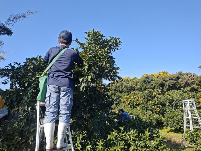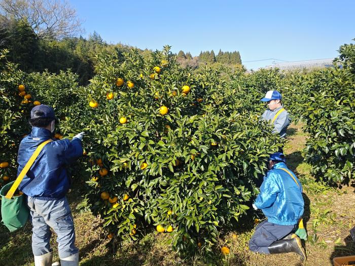 12月18,19日に,鶴翔高校農業科学科の1,2年生及び食品技術科1年生,計51人が,阿久根市桐野地区を中心に,甘夏の収穫作業を行う地域貢献活動を実施しました。農政普及課は,12月15日に甘夏の収穫方法や生産概要,栽培管理,出荷までの流れ等について事前講習を行いました。甘夏は収穫時期の労力確保が課題となっており,この収穫実習に期待する生産者も多い状況です。生産者からの評判はおおむね良好であり,冬季のアルバイトに勧誘したいとの声も多く聞かれました。労力確保の取組について,引き続き支援します。