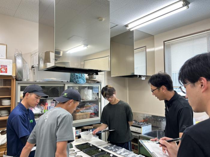 8月18日,25日に出水地区の茶業青年4人が,8月27日に鹿児島県茶流通センターで開催される闘茶会に向けて,勉強会を行いました。闘茶会では,外観により生産県を判別する技術や,煎出液により品種を判別する技術を競うことから,勉強会では,外観や滋味を言語化し,判別する力を身につけました。闘茶会本番では,惜しくも上位入賞はなりませんでしたが,今回の研修を通して,品種特性を把握することができ,我が家の小売り茶の配合割合や,新品種導入の際の知見を得られたという声が聞かれました。