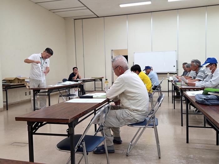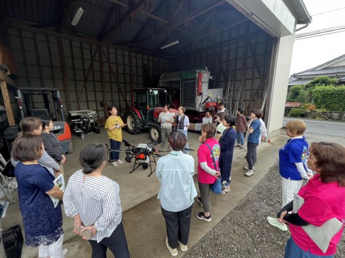 9月25日,東干拓土地利用型営農研究会と出水市駐在の共催で研修会を開催し,農家20人,関係機関21人の計41人が出席しました。研修会の主な内容は,営農支援システム(KSAS)とドローン等を活用した水稲の収量向上で,KSASでのほ場登録やドローン「T25K」での肥料散布を実演しました。多くの農家が,ドローンでの穂肥散布に興味を示し,今後は穂肥の判断を衛星画像等で行えるよう,情報収集を強化していきます。スマート農業技術を活用し,軽労化,省力化と併せて生産性向上も図っていきます。