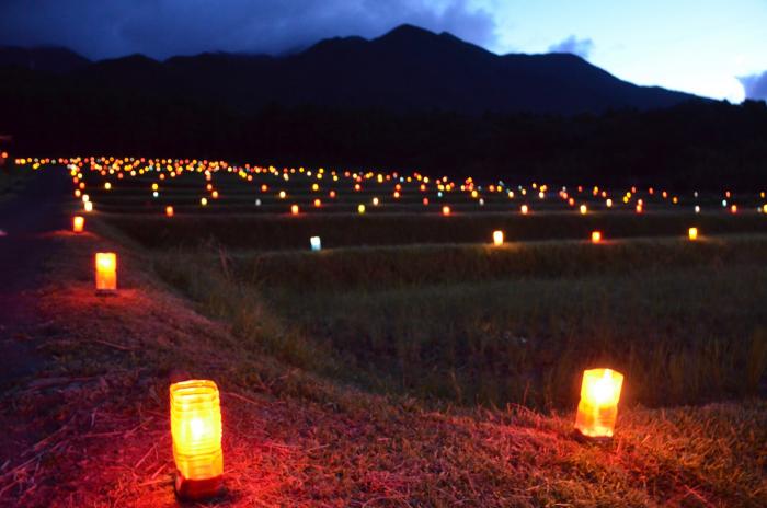 椨川新田の棚田では,毎年,8月末頃に棚田まつりが行われます。先祖が残してくれた棚田への感謝と今後の保全を祈って開催されています。棚田の畦道に設置された約800本の灯篭に火が灯されると棚田が光の帯に彩られ幻想的な風景が浮かびあがります。
