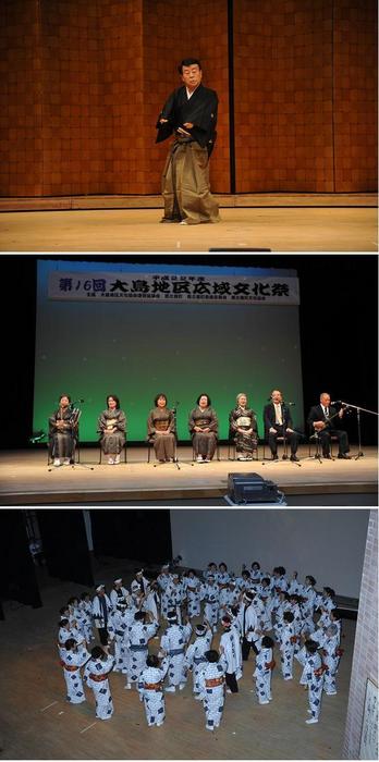 広域文化祭では,徳之島名物の「闘牛」をウシの人形と映像を使って紹介した後,白の衣装を身にまとった亀津南区の方々が円形になって「浜踊り」を披露しました。