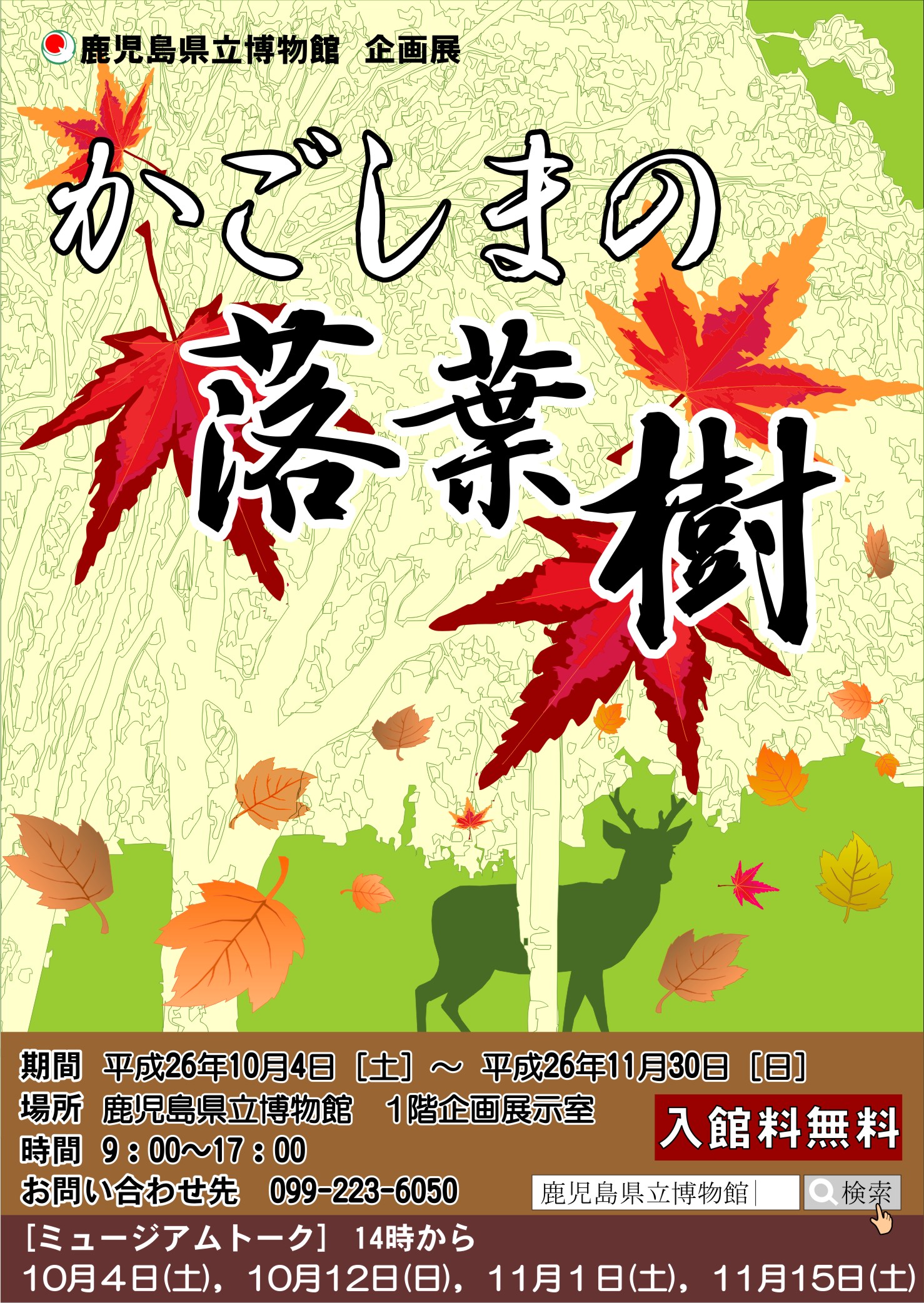 秋は紅葉の季節。落葉樹の葉が紅色や黄色,褐色になって落ち,樹木は冬の寒さに耐えます。鹿児島の落葉樹は高い山に生えるブナやカエデだけでなく,平地にはハゼノキやネムノキなどの成長が速いものもあります。本企画展では亜熱帯から冷温帯に見られるかごしまの落葉樹の種類やその特徴,人との関わりなどについて紹介します。