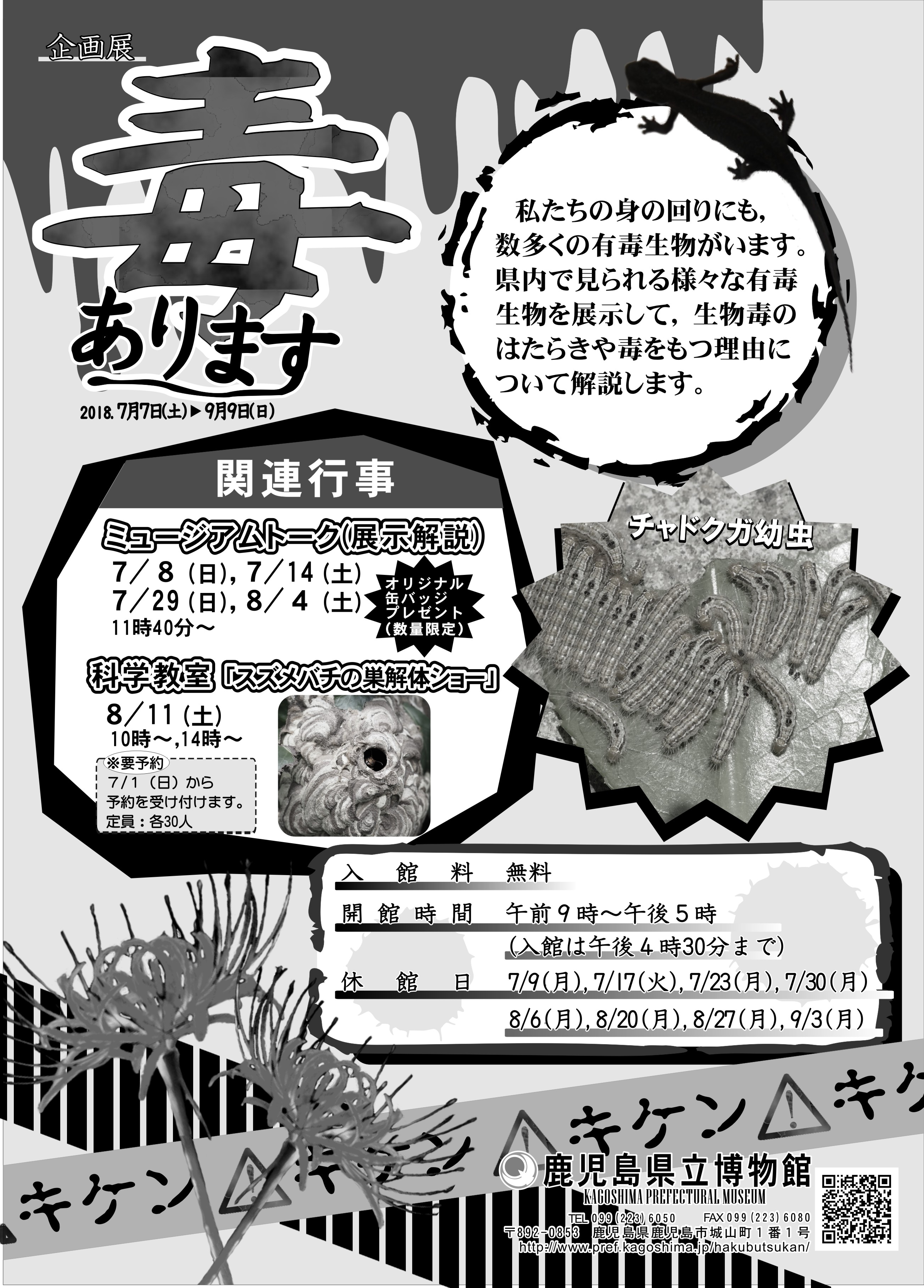 私たちの身の回りにも,数多くの有毒生物がいます。県内で見られる様々な有毒生物を展示して,生物毒のはたらきや毒をもつ理由について解説します。