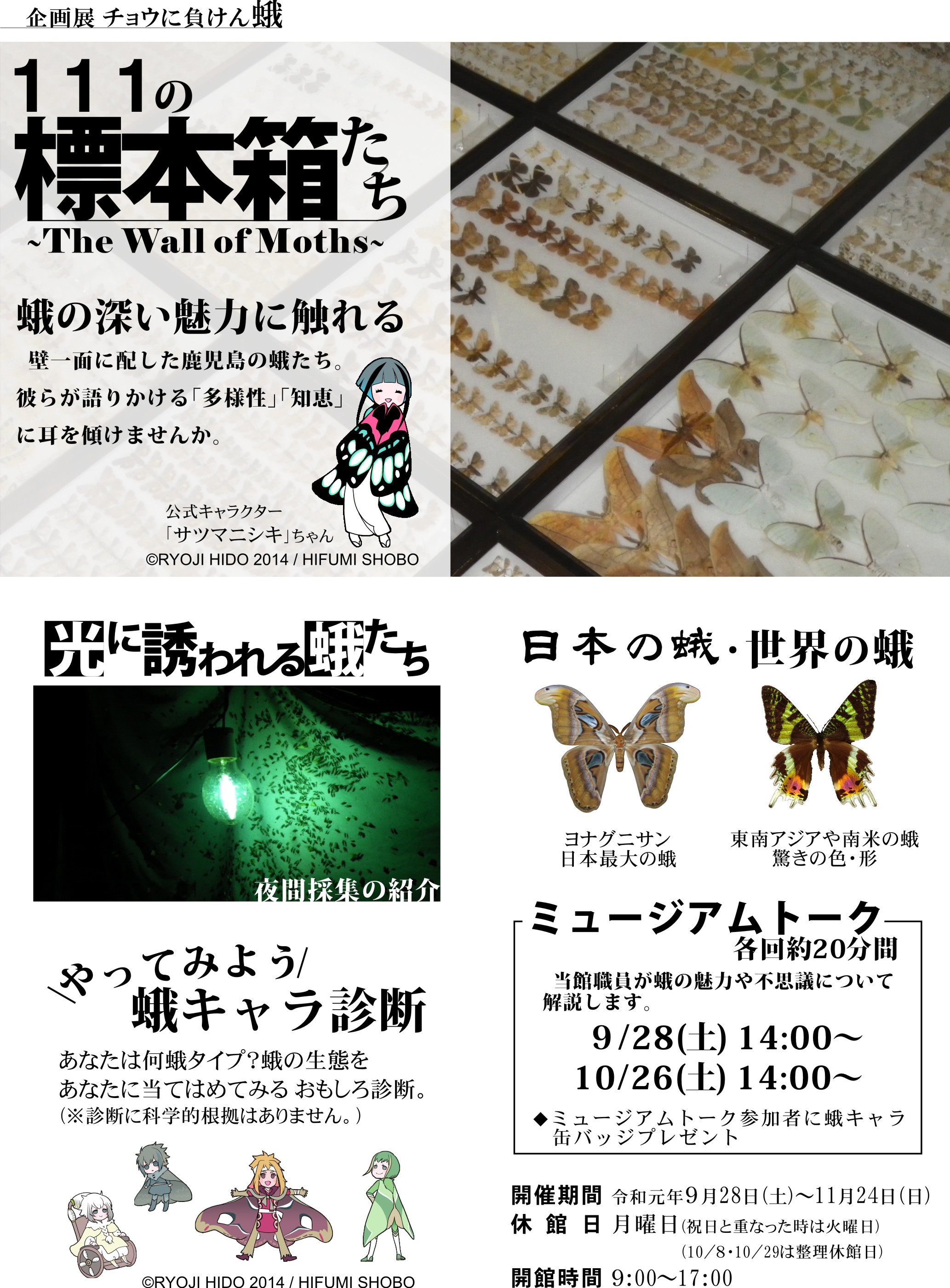 博物館には,主に県内各地で採集された蛾類の標本が,100箱以上収蔵されています。これらの標本を一堂に展示し,蛾類の多様性を紹介します。お気に入りの蛾を見つけてください!
