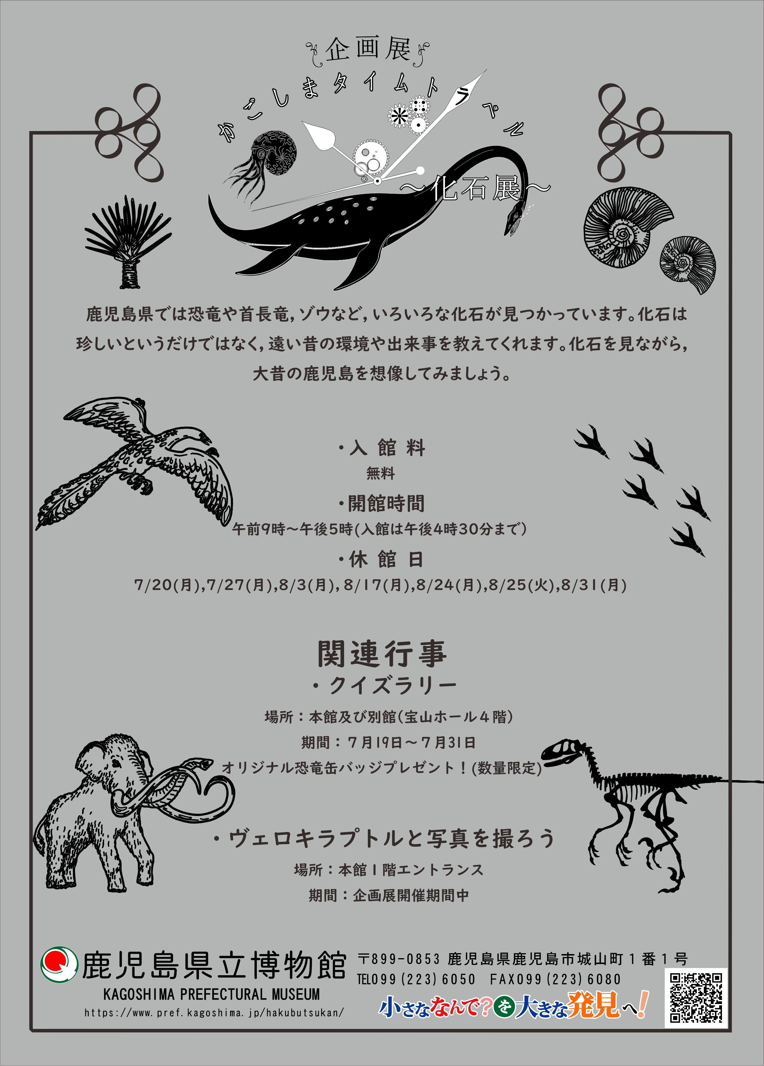 鹿児島県では恐竜や首長竜,ゾウなど,いろいろな化石が見つかっています。化石は珍しいというだけでなく,遠い昔の環境や出来事を教えてくれます。化石を見ながら,大昔の鹿児島を想像してみましょう。