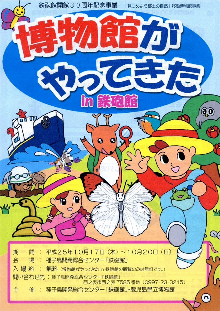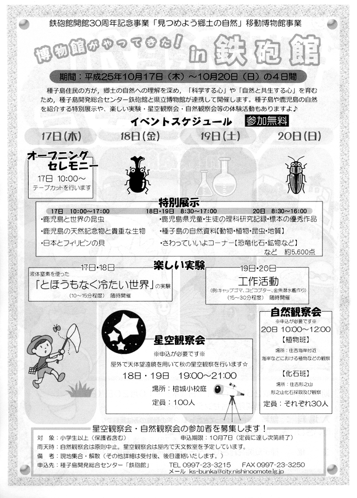 鹿児島県立博物館と,種子島開発総合センター「鉄砲館」との共催で,鉄砲館開館30周年を記念して「博物館がやってきたin鉄砲館」を行います。