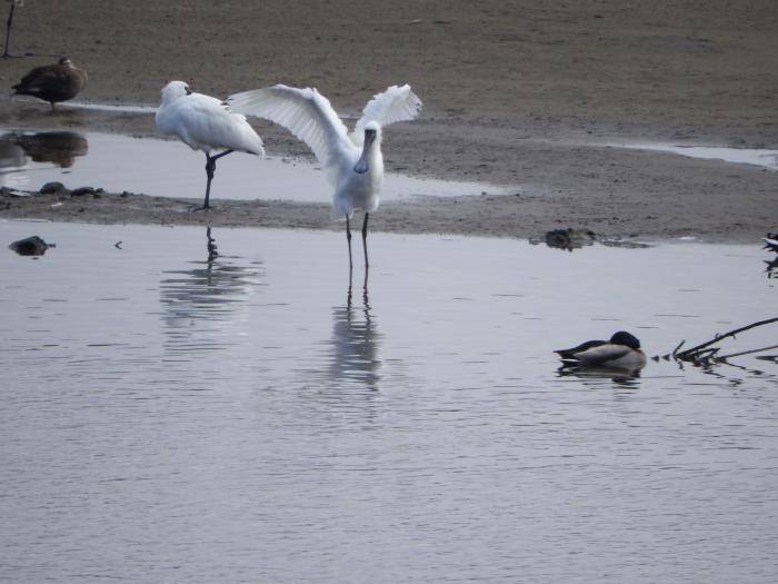 その中には,絶滅危惧種にも指定され,県内では万之瀬川流域を含め2カ所にしか渡って来ないクロツラヘラサギもやってきました。干潟や浅瀬でくちばしを細かくふるわせ,魚類や甲殻類などを食べています。11月22日(日曜日)の主催事業「バードウォッチングとカヌーを楽しもう」の際には,26羽が確認されました。その他にもマガモやカルガモ,カワウなどの渡り鳥が万之瀬川で見られます。
