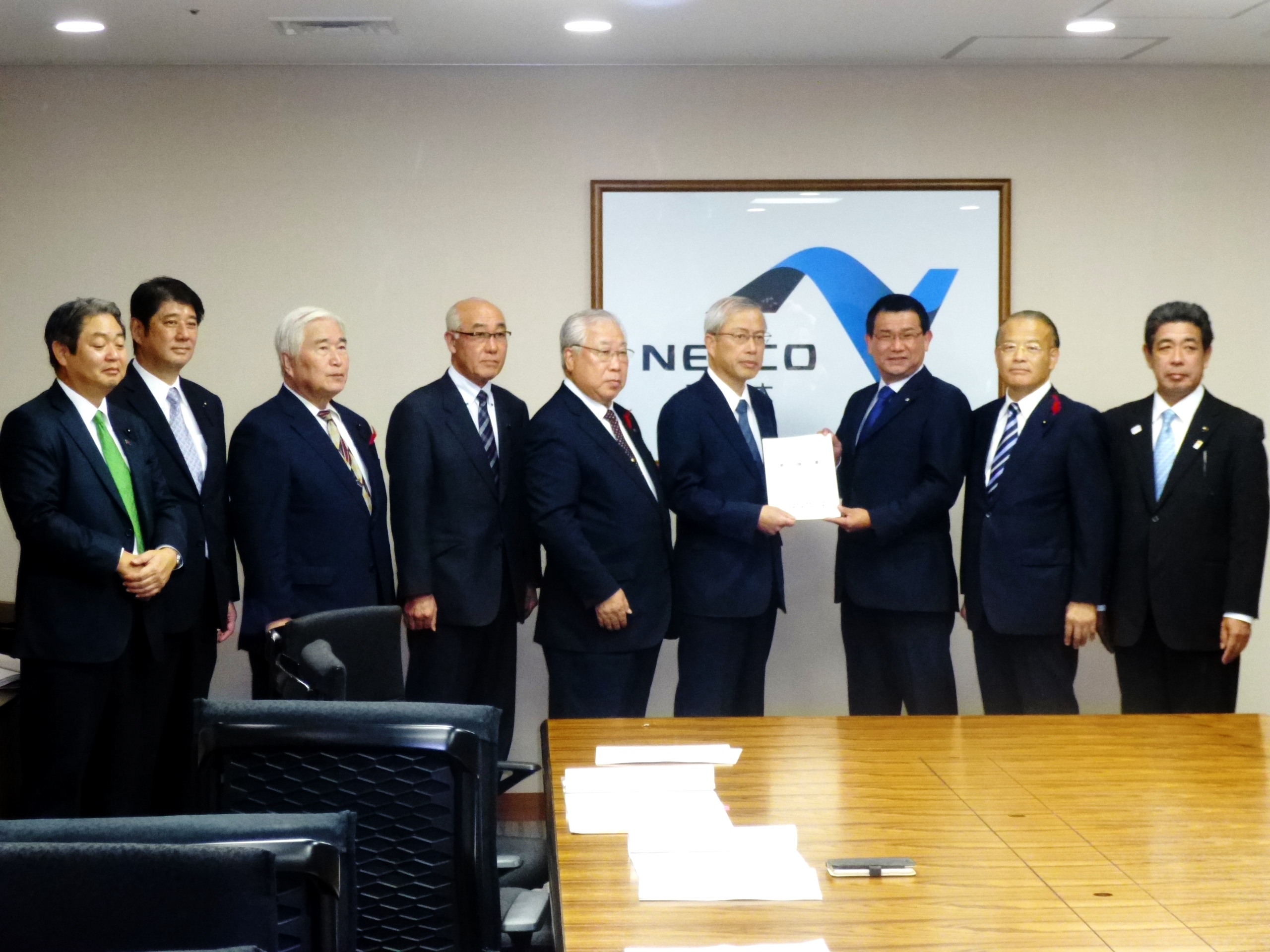 10月31日,九州各県議会議長会(会長:松里鹿児島県議会議長)及び東九州軸陸上交通高速化促進4県議会議長会(会長:松里鹿児島県議会議長)は,西日本高速道路株式会社本社(大阪市)を訪問し,東九州自動車道の建設促進について要請を行いました。