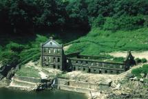 伊佐(いさ)市の「曽木(そぎ)の滝(たき)」下流の湖底にある産業遺産(いさん)です。明治42(1909)年に建設(けんせつ)された発電所の跡(あと)で、当時は国内最大級の発電力がありました。日本の電気化学工業発祥(はっしょう)の地ともいわれています。昭和40(1965)年の鶴田(つるだ)ダム完成により湖底に沈み(しずみ)ましたが、水位が下がる5~9月には、ヨーロッパのお城を思わせるレンガづくりの建物が姿(すがた)を現し(あらわし)ます。
